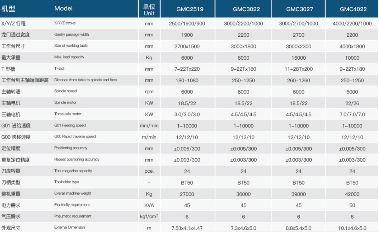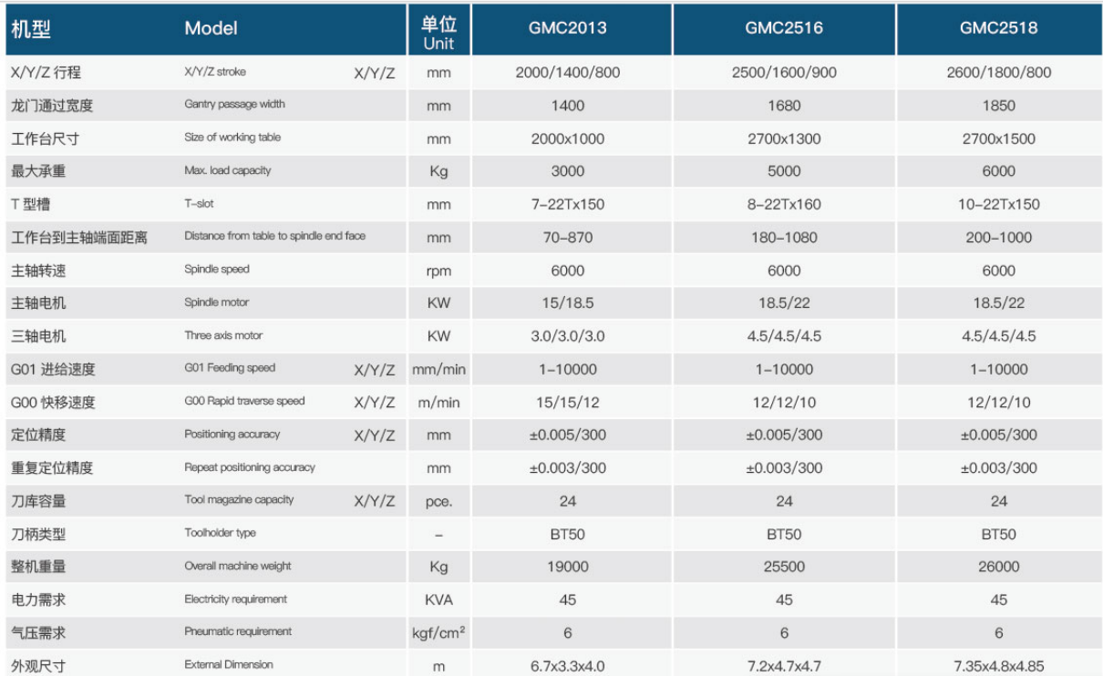 GMC系列龙门加工中心适用大型模具与工件的高精密加工该系列机床主要加工中大型箱体类、复杂曲面模具、大型异形、板类零件的加工。广泛应 用于机械、汽车、飞机、航空航天、船舶等领域的产品加工中,能适应从粗加工到精加工的加工要求,可完成铣、钻、攻、镗等多种工序。