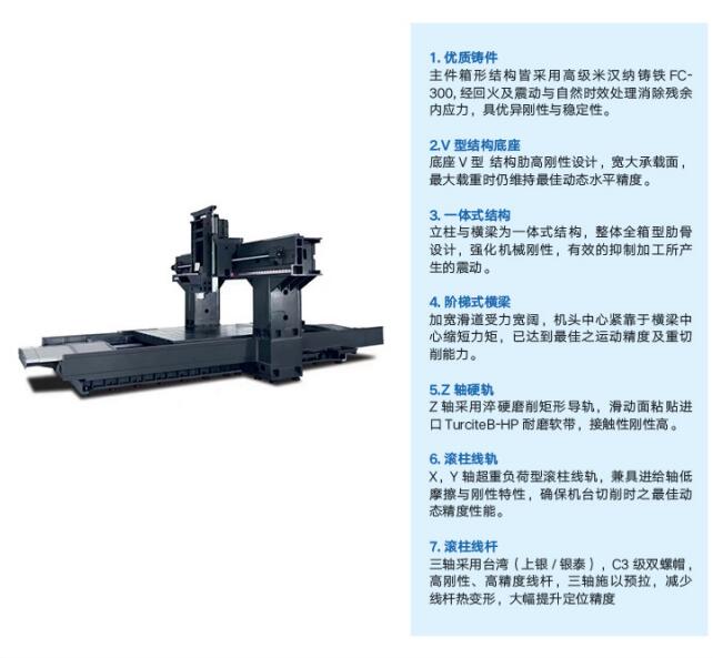 ● 标配中国台湾BT50转机械主轴,X、Y轴重载滚柱线轨,Z轴硬轨,适合较大模具、大零件、模框的刚性高速加工。